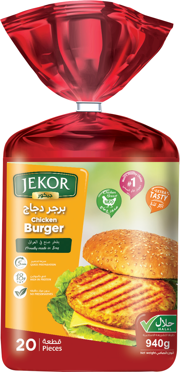 Jekor chicken burgers are purely made of fresh chicken breast fillets and baked in a tasty and soft patty. It is prepared with unique spices and peppers to create a delicious juicy chicken patty that just melts in your mouth.
