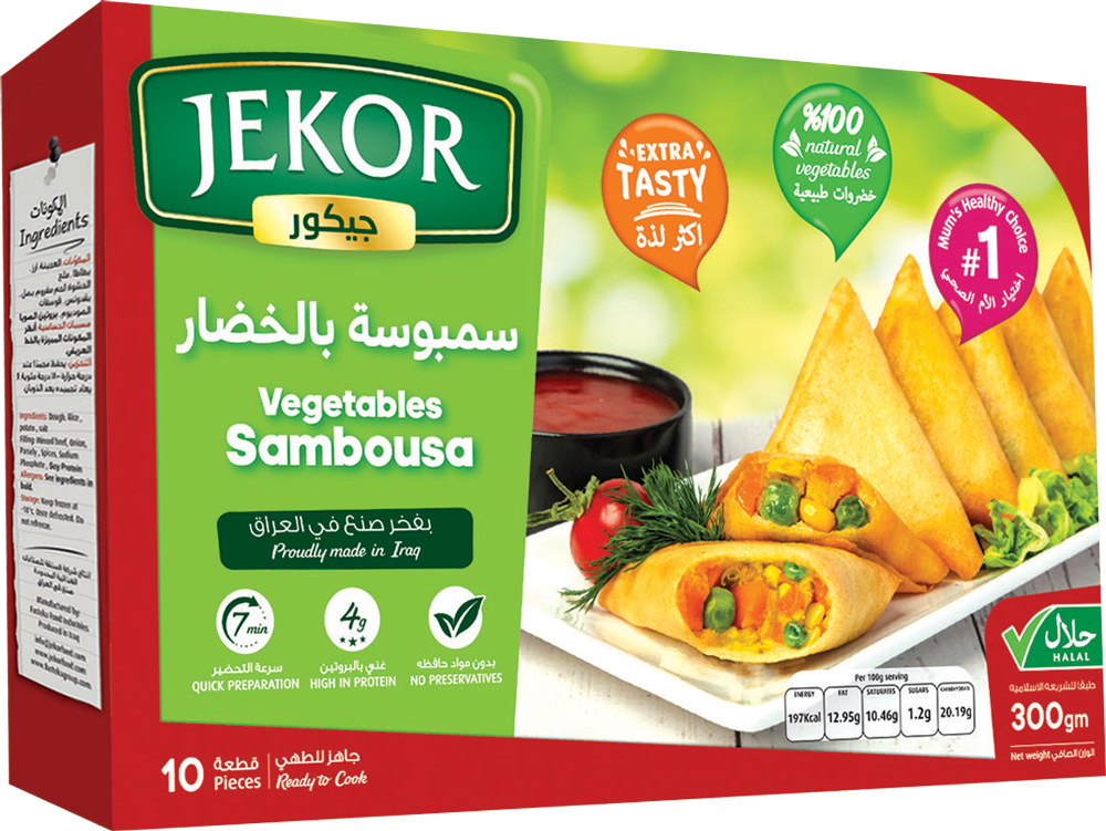 Jekor Vegetables Sambousa is a crunchy fried triangular shape patti with a mix of fresh vegetables. The filling contains a mixture of carrots, onion, potatoes, green peas, and a mixture of spices to give it an irresistible taste healthy, and vegan flavor.